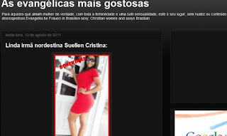 Já o blog “As evangélicas mais gostosas” é bem mais light, mas igualmente humano. Retrata meninas evangélicas em fotografias feitas em poses clichês, vestidas, obviamente, mas sempre com aquele olhar brejeiro, que certamente motivou a exibição da foto no site.